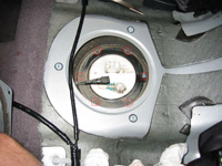Remove the fuel filter assembly by pulling straight up at first and then tilting sideways. Note the floater arm assembly hanging off the passenger side of the assembly. You'll need to tilt the assembly toward the passenger side once the unit is about halfway out of the tank so the floater arm assembly can be navigated out of the tank.